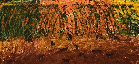 Göta Fogler (1919-1992), Sverige. Olie på Lærred. Abstrakt landskab med dyr. 1960'erne.Lærredet måler: 115 x 54 cm.