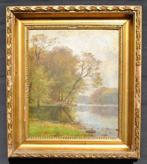 Aagaard, Carl Frederik (1833 - 1895) Danmark.: En båd på en sø - forår. Signeret 1893. Olie på lærred. 28 x 23,5 cm. Indrammet. 38 x 34 cm. Emne nummer: 22724