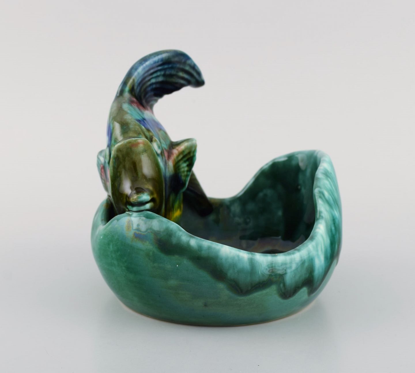 Belgisk studio keramiker. Skål i glaseret keramik modelleret med fisk. Smuk glasur i blågrønne nuancer. 1960/70'erne.Måler: 15 x 15 cm.