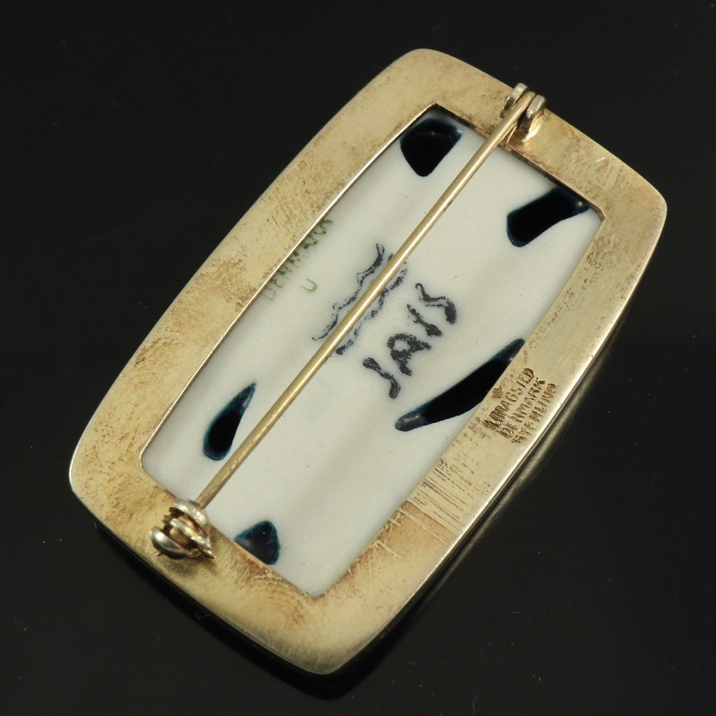Jais Nielsen 1885-1961. Broche i keramik med blå glasur med montering i forgyldt sterling sølv.Tegnet af Jais Nielsen 1885-1961 og udført hos A. Dragsted & Royal Copenhagen.