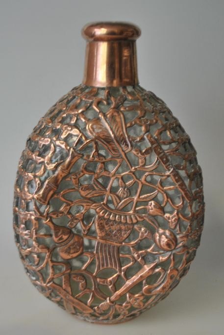 Antik whiskey flaske med kobber dekoration, 19./20. årh. Orientalsk arbejde. Hele flasken er dekoreret med mønstre og figur kompositioner, bla.a. kurv med blomster, sværd m.v. Højde.: 22 cm.Indvendig er flasken gået i stykker i toppen.
