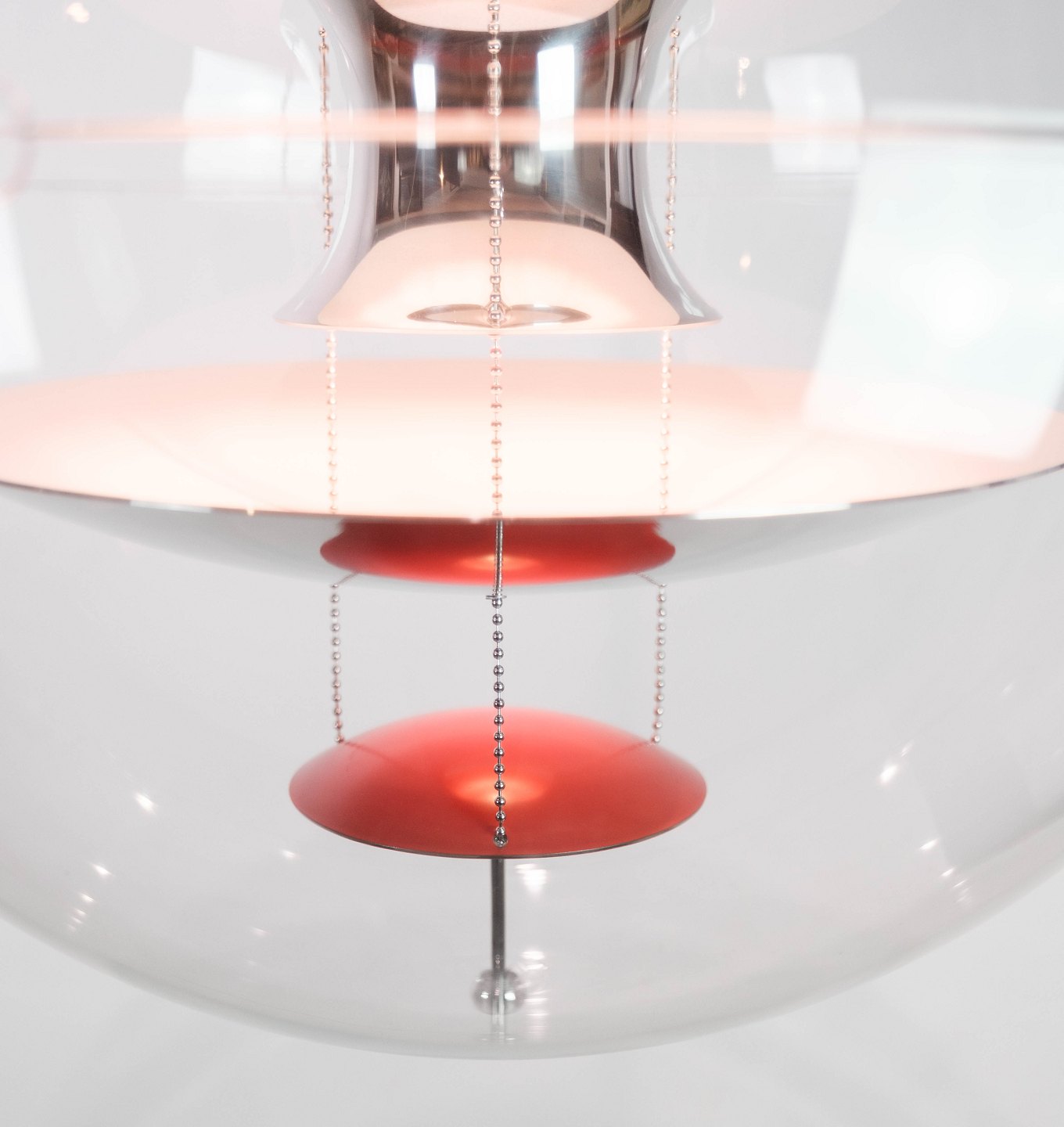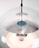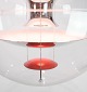 Globe, Ø50, designet af Verner Panton i 1969. Lampen er af transparent akryl med 5 ned hængte metal reflektorer, som er lakeret i hvid, rød og blå. Verner Panton Globe pendlen er super flot og tidløs. Den passer godt ind i mange af hjemmets run, og kan places for en hyggelig og stemningsfyldt belysning. Lyskilden er E14 MAX 60 Watt i Ø40 og lyskilden er E27 MAX 75 Watt i Ø50.Lager: 3