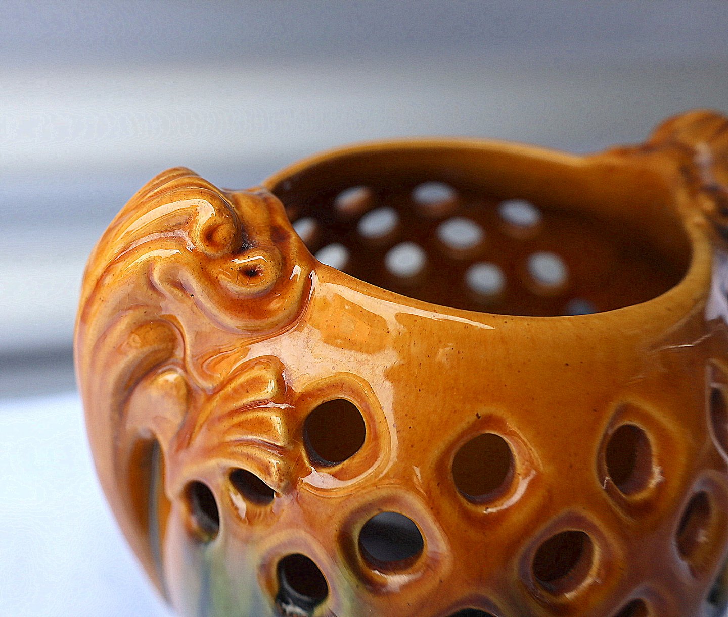 Michael Andersen, Bornholm. Vase/krukke i keramik, med gennembrudt kant. På siderne er der modelleret et firben. Vasen/krukken er med løbeglasur.Vasen/krukken har lidt krakelering i glasuren.