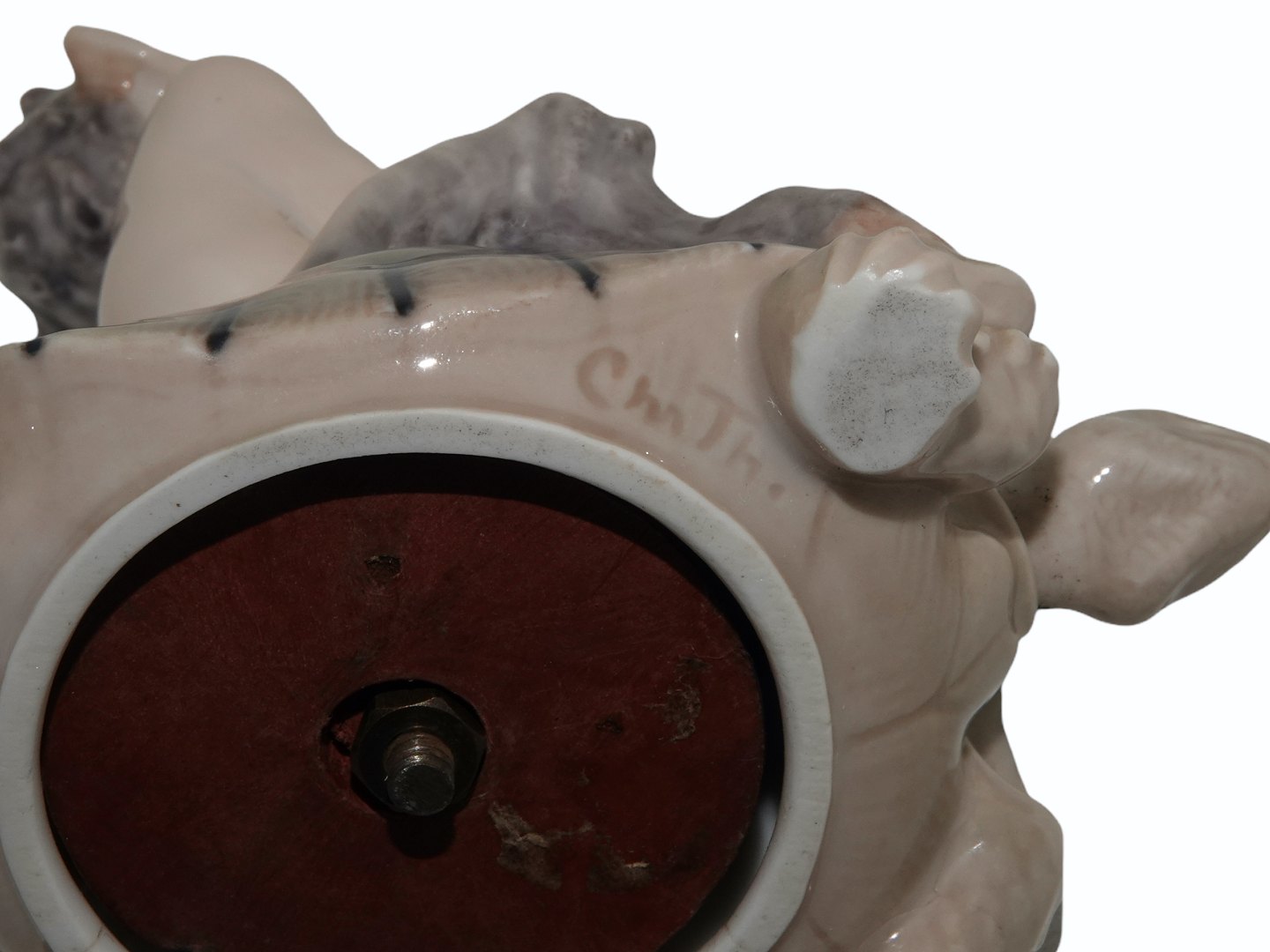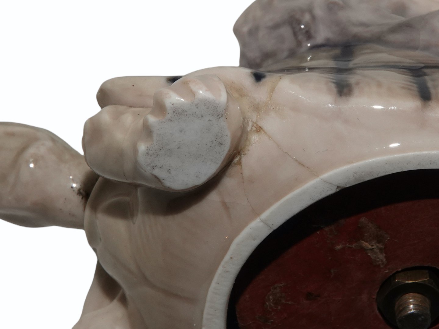 Klokkefunktionen virker ikke og der er skår på et af ørerne. Endvidere er der hårrevner på bunden samt en gammel reparation på et af benene på skildpadden.