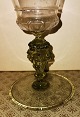 Par vinglas med grøn fod i presset grønt glas. Ejerinitialer på kummen. Meget lette. Formodes fremstillet i det sydlige europa omkring 1900. Muligvis Italien. Fremstår i god stand uden skader eller reparationer. H. 17 cm.v/ Jesper Reutemann