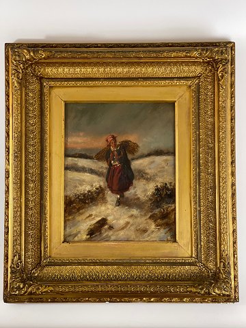 Antique painting of a girl collecting firewood in an old gold frame. 19th century. Signed Hardy.Light dimensions: 23 x 28 centimeters.