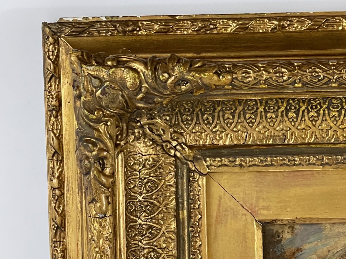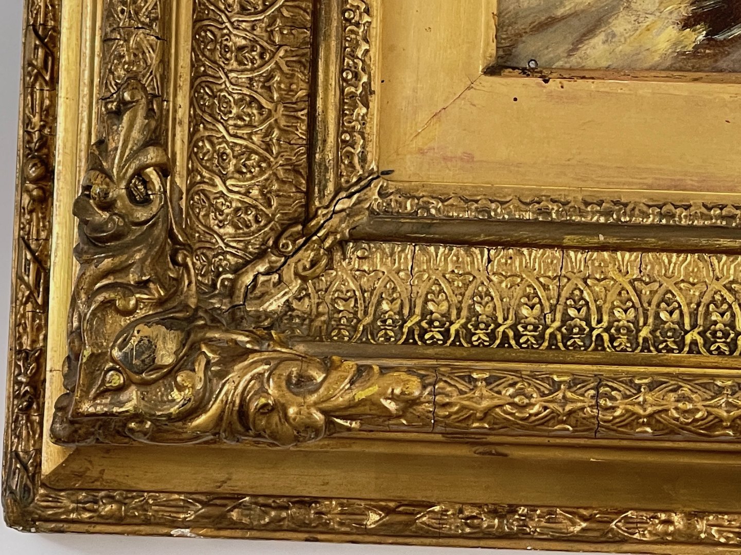 The painting is in fine condition according to age, small retouches and a nail in the outer edge of the painting's surface (see photo). Frame with "hair cracks" and other age-related traces of use - see photos.