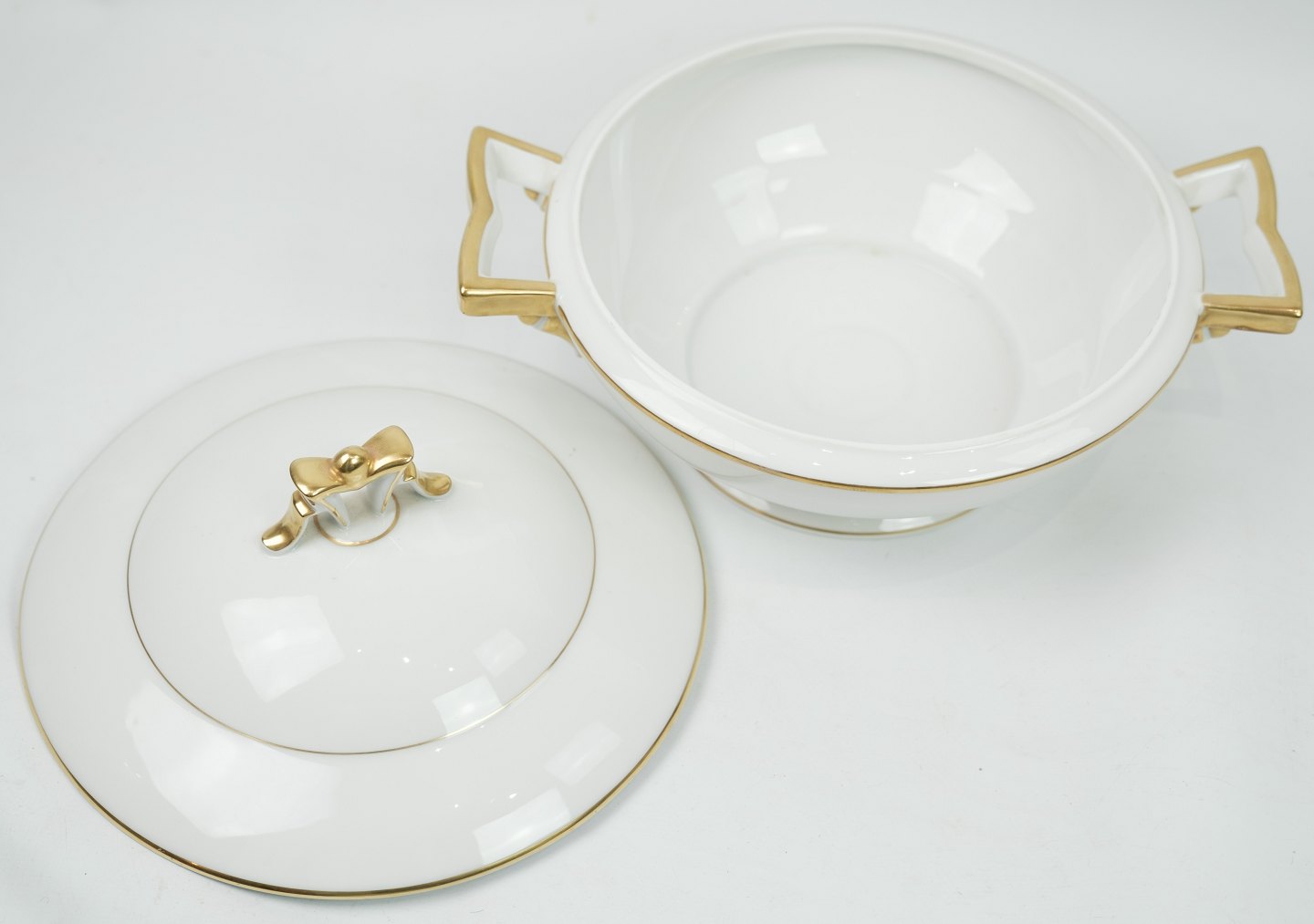 Låg terrin af porcelænsfabrik Hautheim, model 7800. Står super flot i guldet i fin brugt stand.Mål i cm: H:16 Dia:23.5