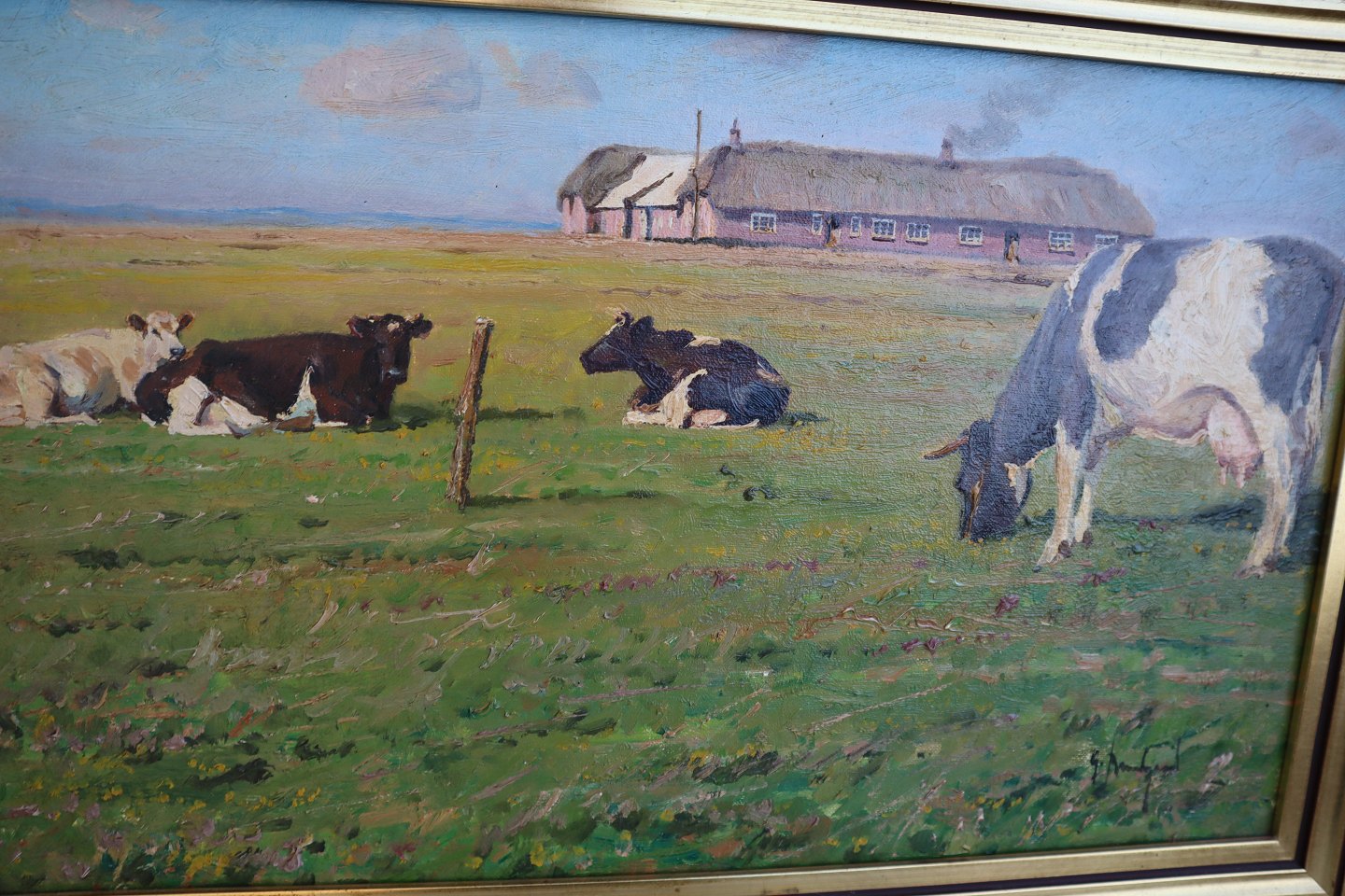 Gunnar Bundgaard Maleri: Olie på lærred Græssende køer ved gård i Vendsyssel 43 x 62 cm inklusiv guldrammeRammen er fin men trænger til en ny forgyldning