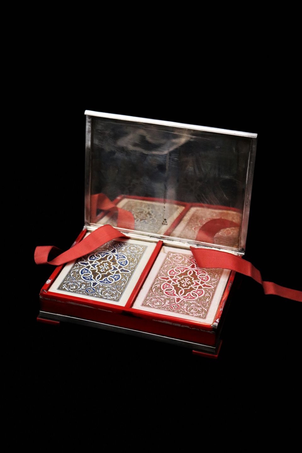Måler H:5cm. 14,5x11cm. Inkl. 2 sæt originale spillekort fra tiden.