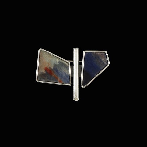 Leon Kastbjerg Nielsen / Hanne Foss Brink. Broche i sterlingsølv med tekstilkunst.Tegnet og udført hos Leon Kastbjerg Nielsen 1986 - i samarbejde med tekstilkunstner Hanne Foss Brink.