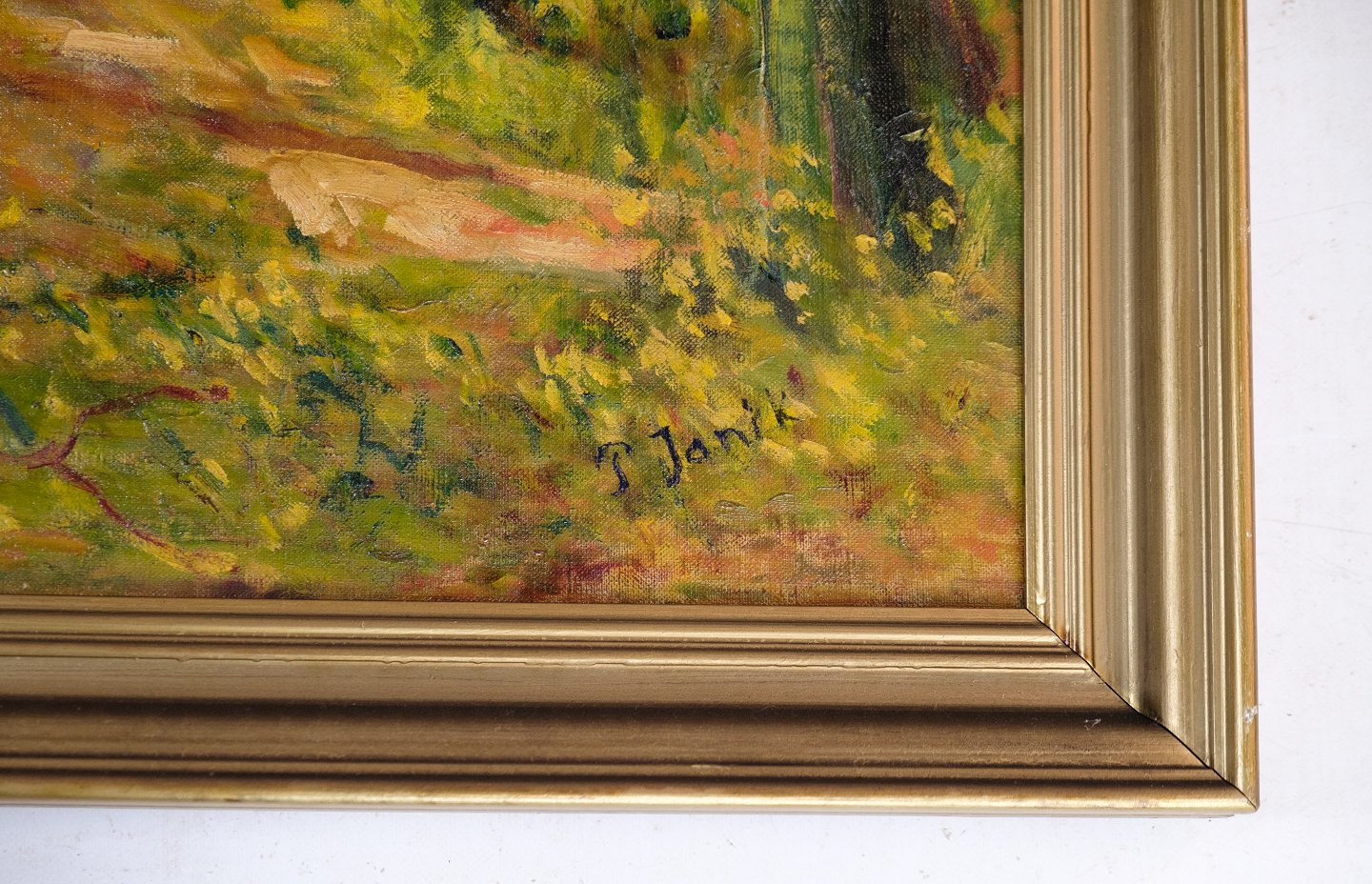 Oliemaleri på lærredet med motiv af skov malet af P. Janick fra omkring 1930'erne.Mål i cm: H:74 B:80.5
