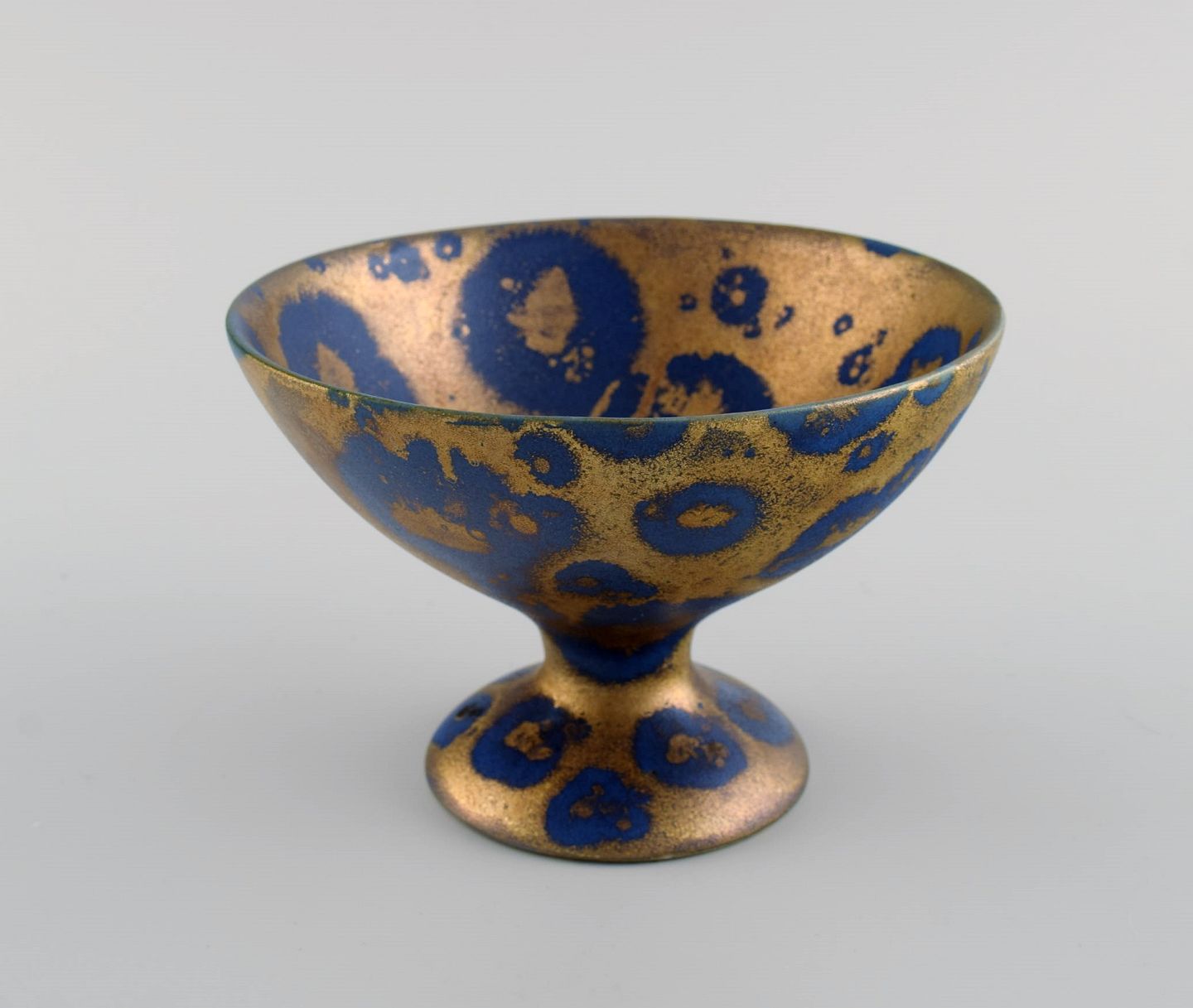Lucien Brisdoux (1878-1963), Frankrig. Skål på fod i glaseret stentøj. Smuk glasur i guld og blå nuancer. 1930/40'erne.Måler: 14 x 9,5 cm.
