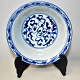 Blå/hvid skål, Kina, 19. årh. Med talrige hånddekorationer ind- og udvendig. På lille standrand. Stemplet. H.: 6.8 cm. Dia.: 16,5 cm.Emne nummer: 24379