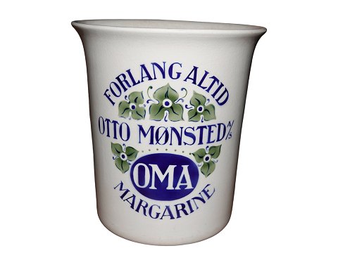 Aluminia med reklame, stor Oma Margarine krukke - Otto Mønsted.Bemærk denne vare er på vores fjernlager. Den kan købes online, eller hvis du vil se den i butikken så skriv eller ring. Vi kan ofte have den i forretningen samme dag.