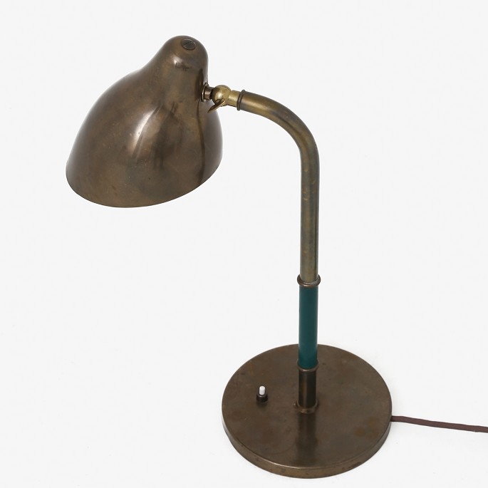 Bordlampe i patineret messing og grønt kaneleret håndtag.