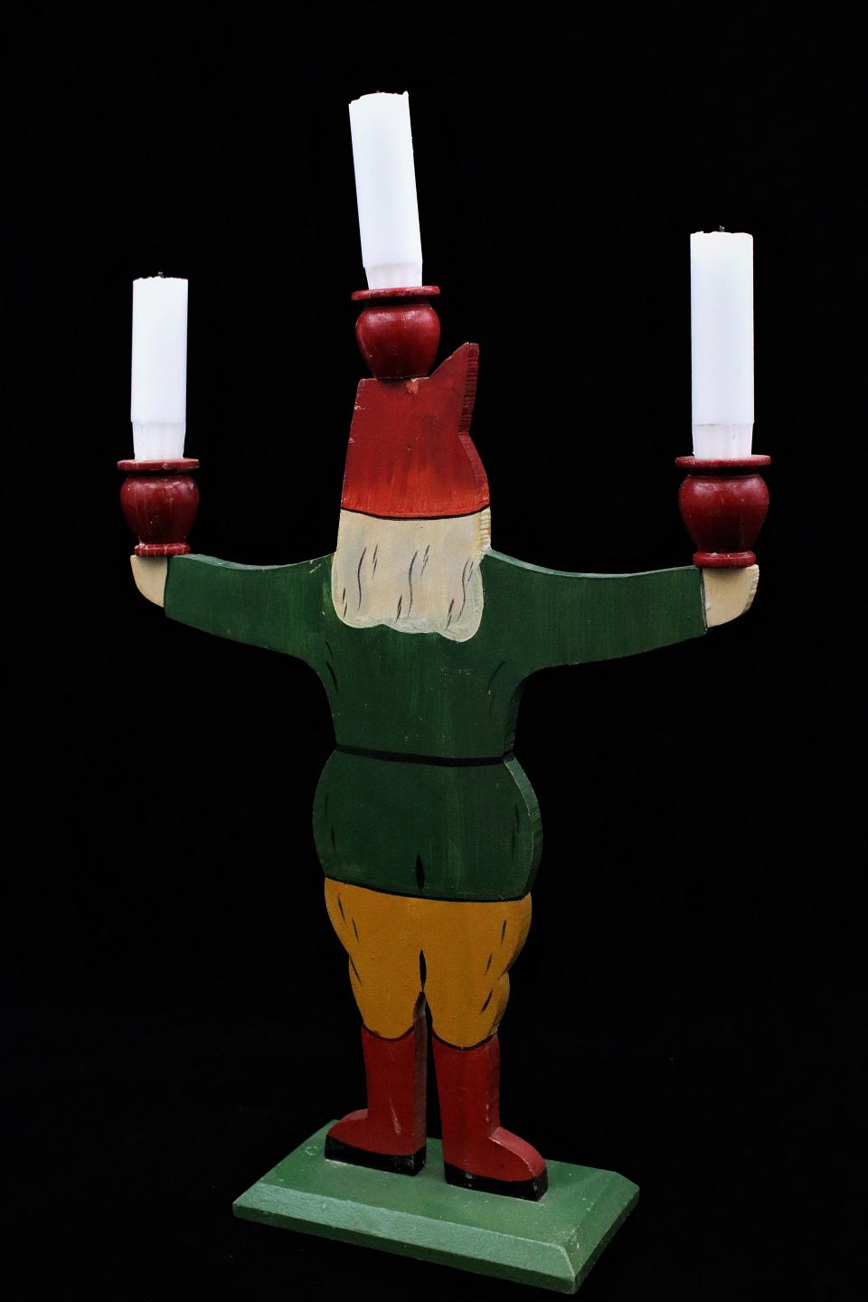 Gammel svensk julenisse lysestage i udskåret træ fra 50érne , bemalet med en fin patina og med plads til 3 stk. alm. stearinlys.H:38cm. B:28cm.