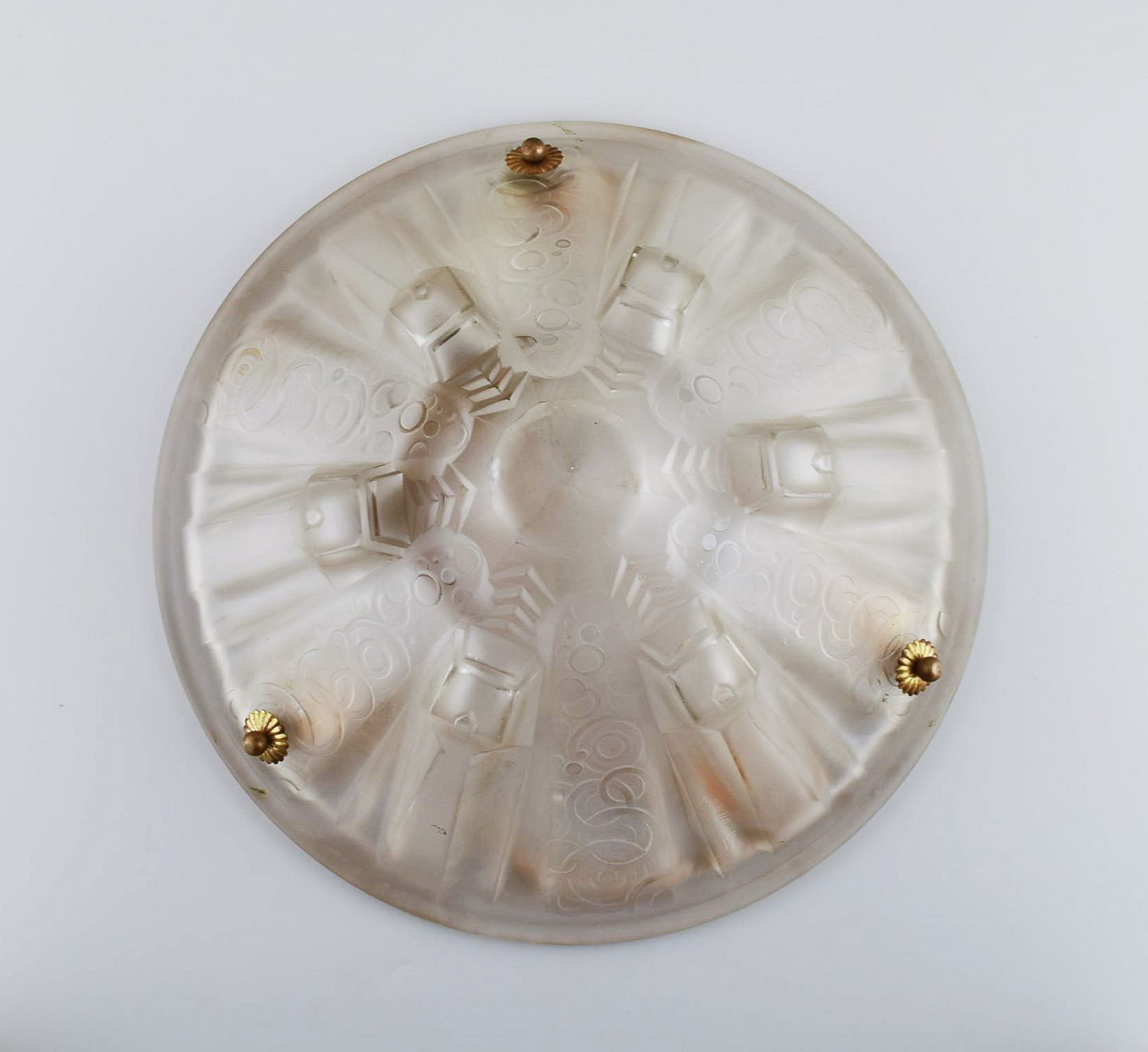 Muller Frères, Luneville. Stor imponerende art deco lysekrone udformet med bladværk i materet kunstglas.1930/40'erne.