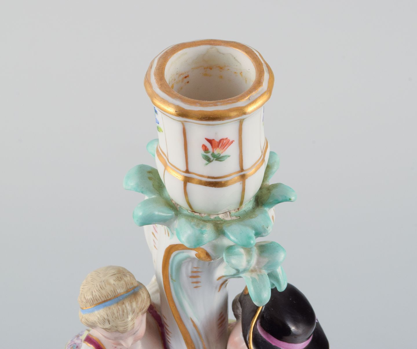 Stor antik Meissen lysestage i håndmalet porcelæn dekoreret med blomster, insekter og fugle. Mand og pige.1800-tallet.