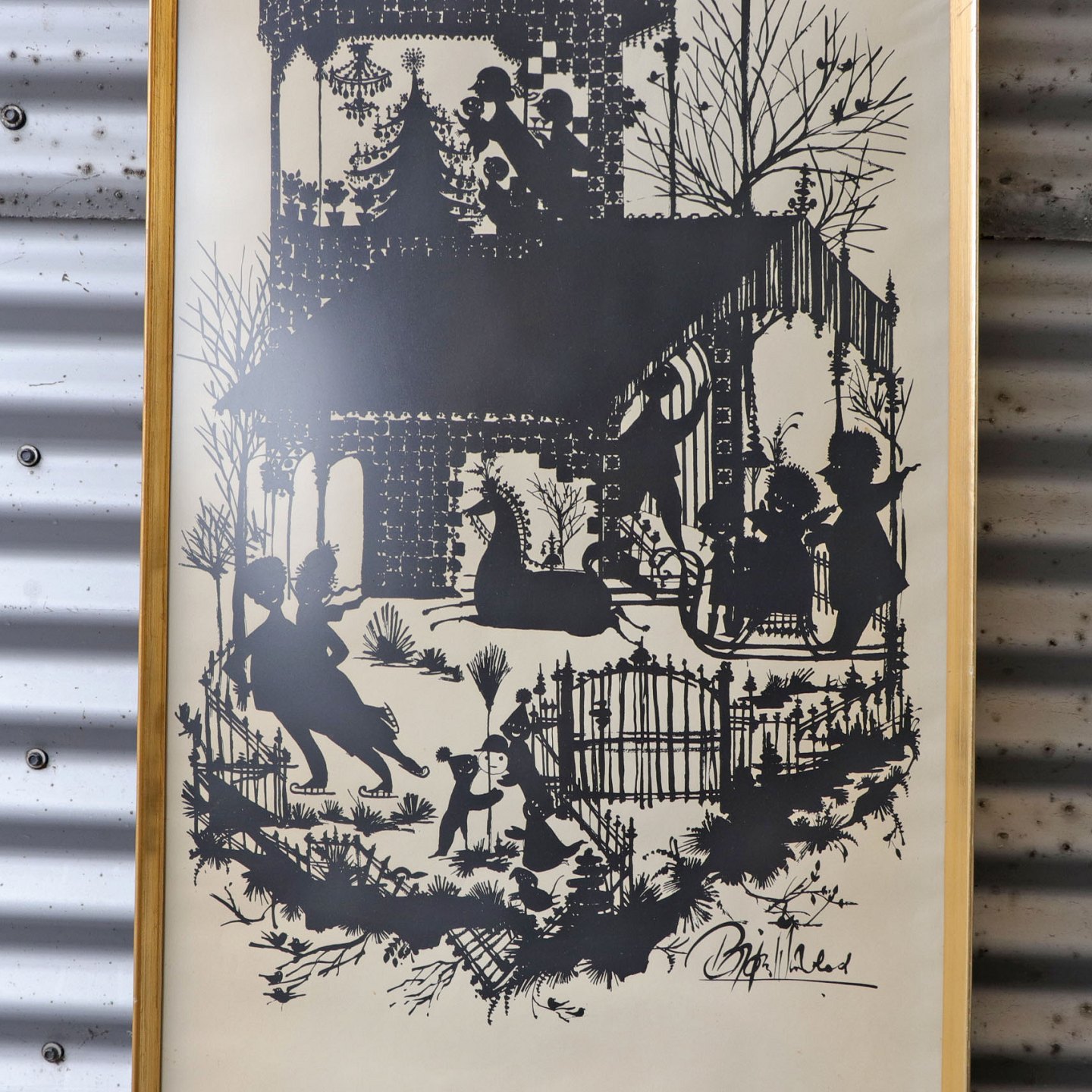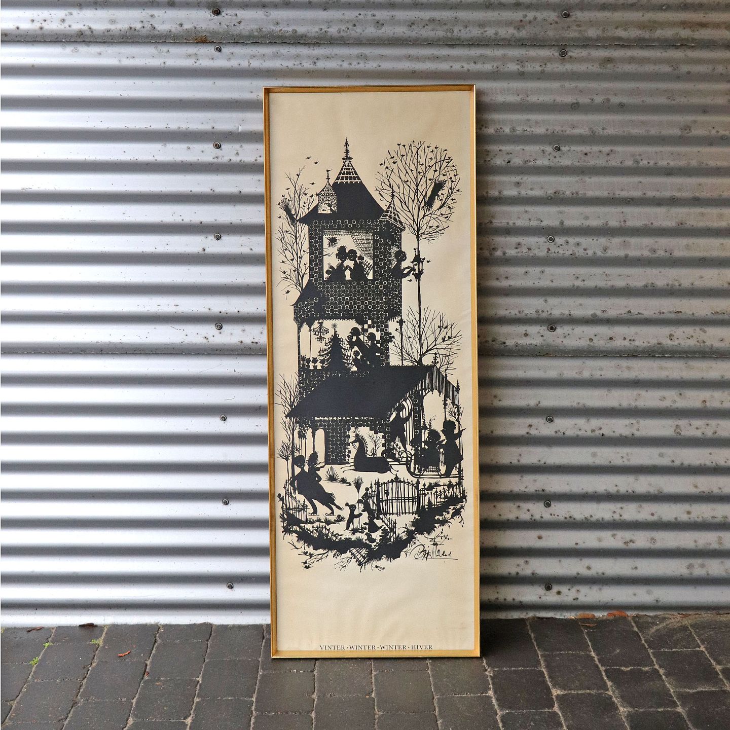 Indrammet litografi i sort med hvid baggrund. Design Bjørn Wiinblad