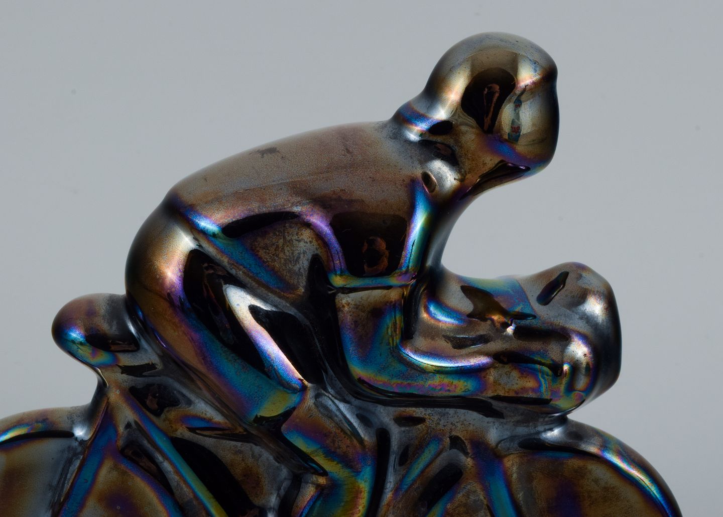 Rambervillers, fransk keramik skulptur i form af cykelrytter med smuk eosinglasur."Pont Neuf - Fismes" premie fra fransk cykelløb.