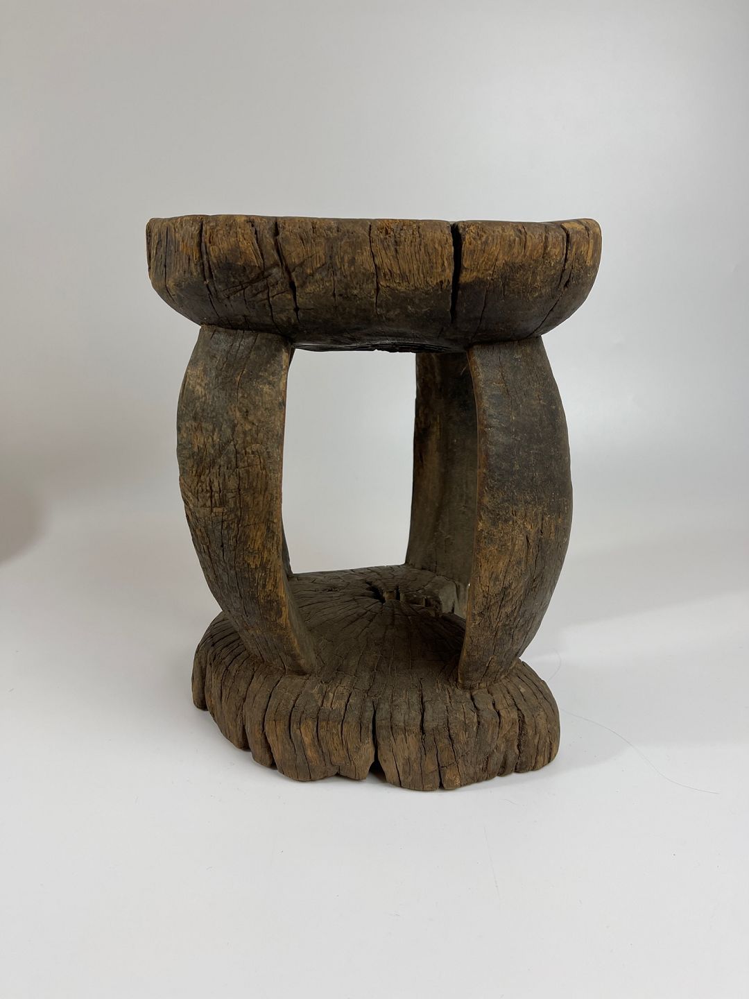 Skammel, Afrika, 20. århundrede. Skamlen er udskåret i et stykke og har top og bund, som forbindes af fire buede ben. Et stykke af budpladen mangler, og stolen har masser af patina, herunder revner og afslag i træet.Højde: Cirka 30 centimeter.