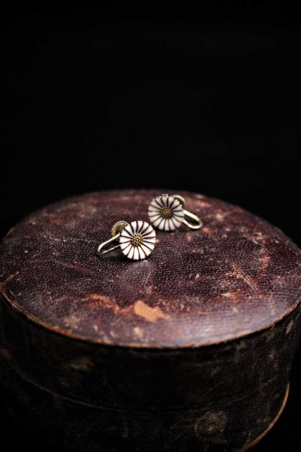 A pair of old Marguerit / Daisy rings with screw in silver and white enamel. Flower Dia.: 1.2cm.Item number: Smykke nr.227