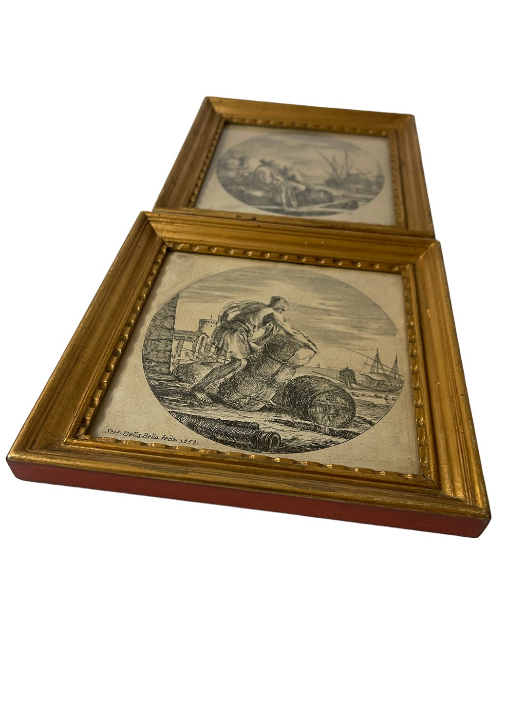 Par raderinger af Stefano Della Bella, 17. århundrede. Senere guldrammer med røde kanter. Skibsmotiver / havnemotiver. Signeret i trykket Stef. Della Bella og dateret 1656.Lysmål: Cirka 13,50 x 13,50 centimeter.