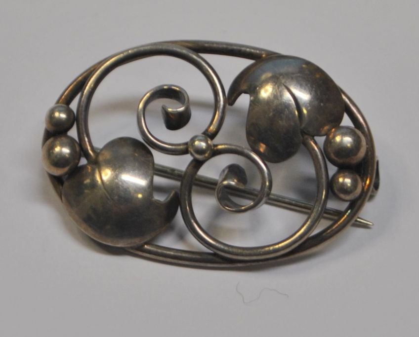 Sølv brosche, Hans Julius Robert Larsen (efter 1948- ) København, Danmark. Stemplet. Dekoreret med blomster. 4 x 2,5 cm.Emne nummer: 25077