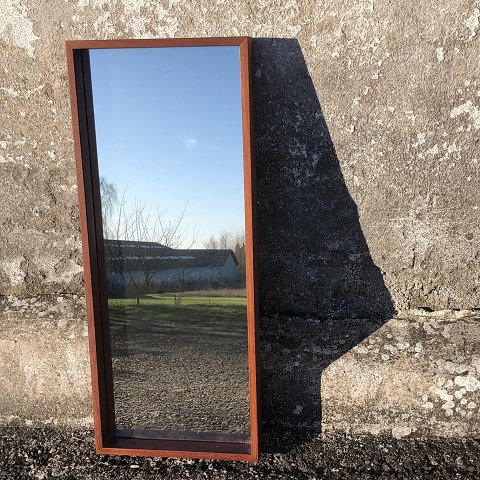 Spejl i ramme af teaktræ. Enkelte småmærker på glasset ellers pæn brugt stand. Mål: 61x25x4 cm.Lager: 1