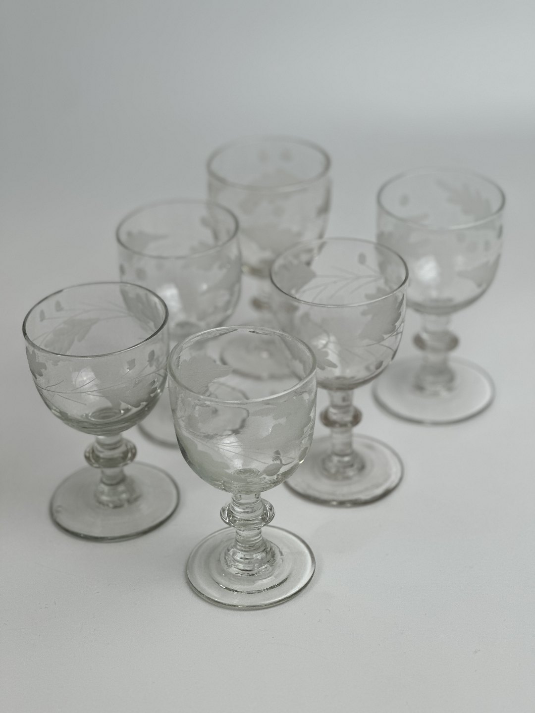 7 stk. i fin stand. 3 stk. med forskellige fejl - et har fejl i glasmassen på kummen (medfødt), et har et miniatureafslag på fodrand. Et har slebet rand.