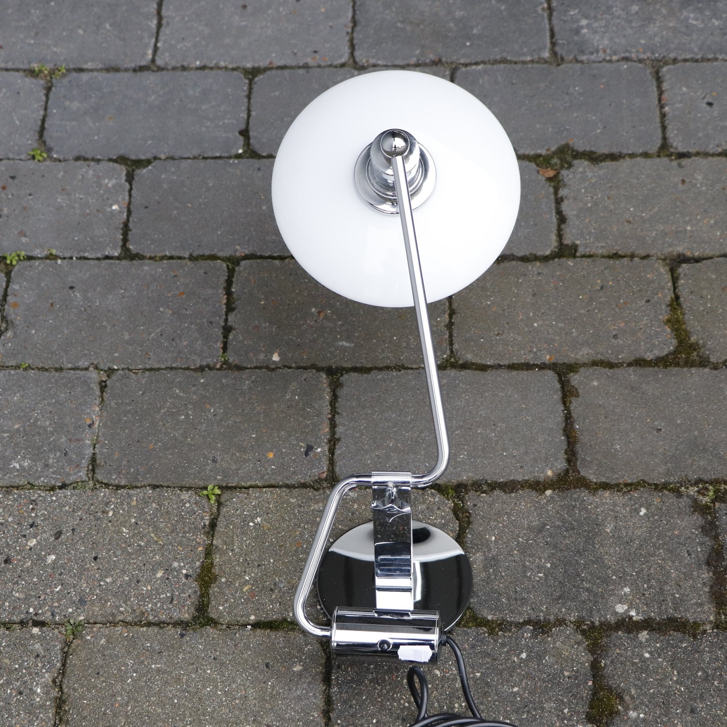 Elegant lampe med opal hvide glasskærme og blank stål stel