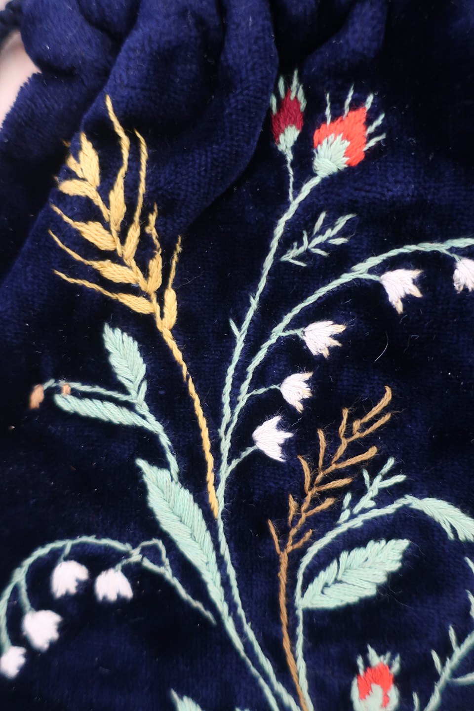 Antik smuk, elegant, gammel håndtaske håndlavet af mørk blåt velour/stofHåndbroderet