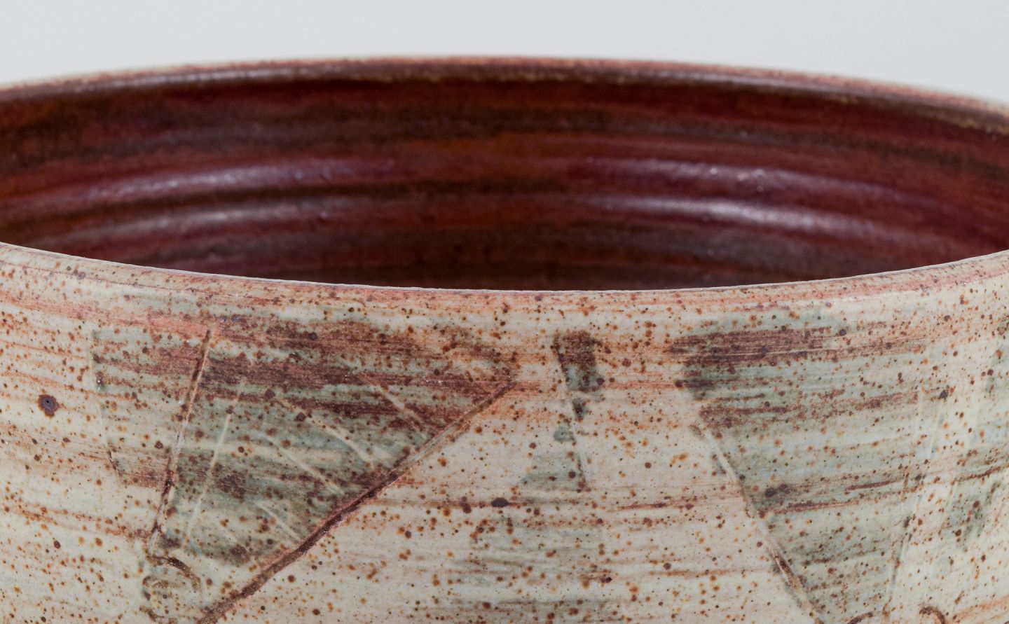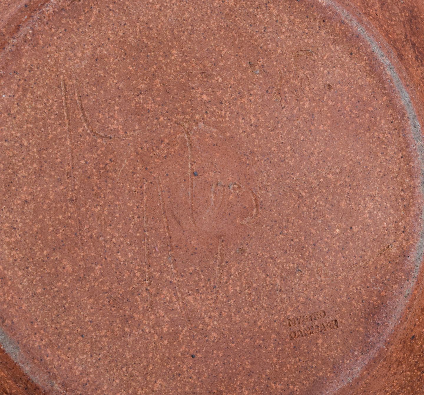 Mogens Nielsen, Nysted, Denmark, large handmade ceramic bowl decorated with abstract motifs. Glazed in brown tones.1978.