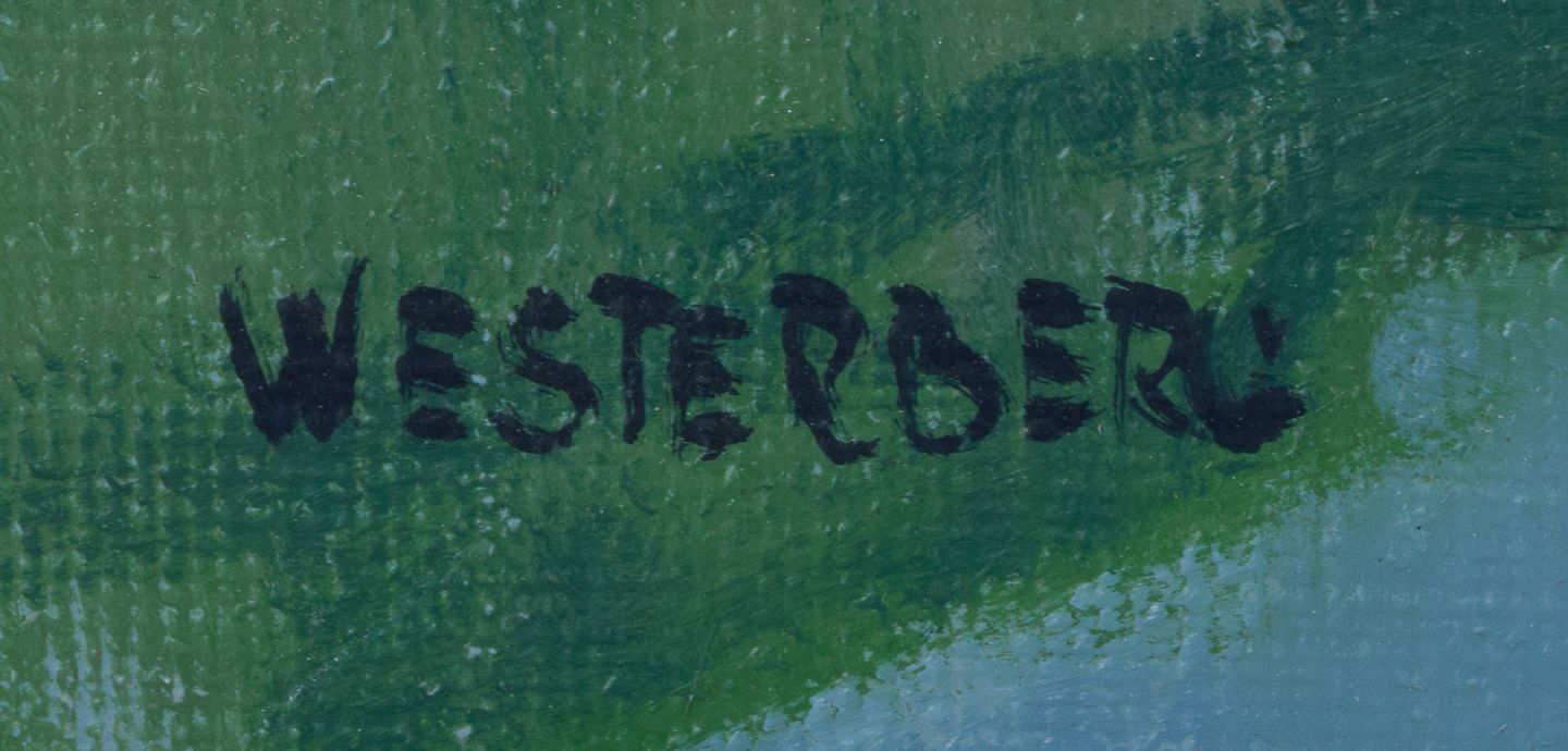 K. Westerberg alias Knud Horup, dansk kunstner, olie på lærred. Modernistisk stil. Landskab med person.