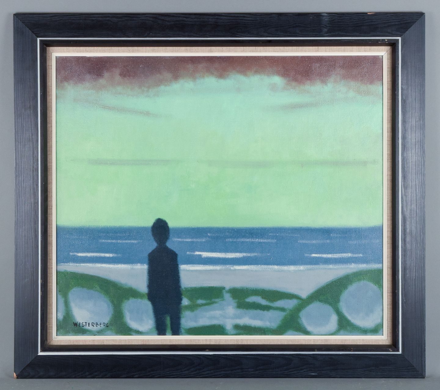 K. Westerberg alias Knud Horup, dansk kunstner, olie på lærred. Modernistisk stil. Landskab med person.1970’erne.