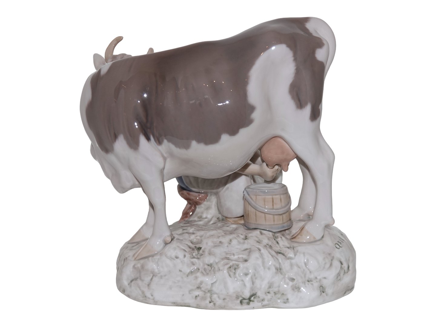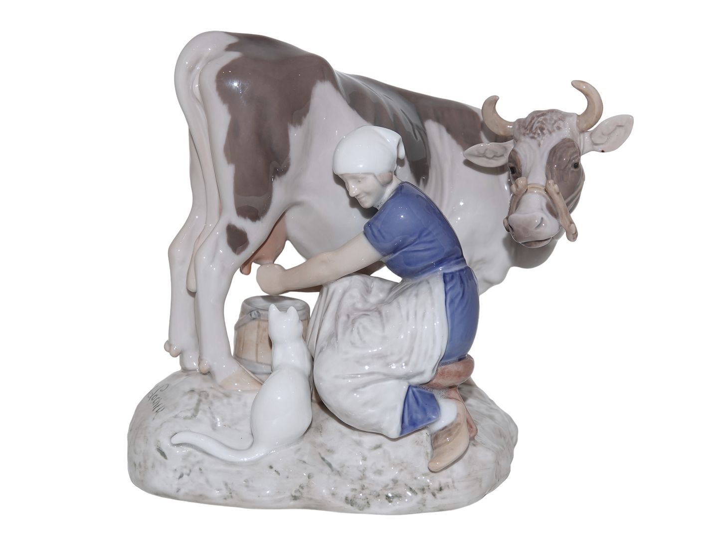 Stor Bing & Grøndahl figur, bondepige med kalv og hvid kat.Af fabriksmærket ses det, at denne er produceret mellem 1952 og 1958.