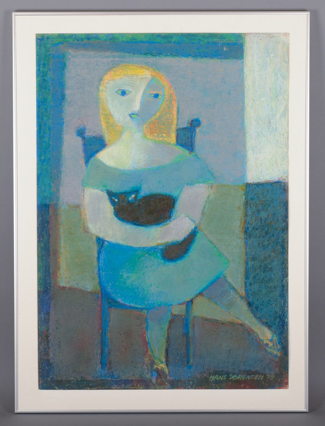 Hans Sørensen (1906-1982), dansk kunstner.Modernistisk portræt af siddende kvinde med kat.