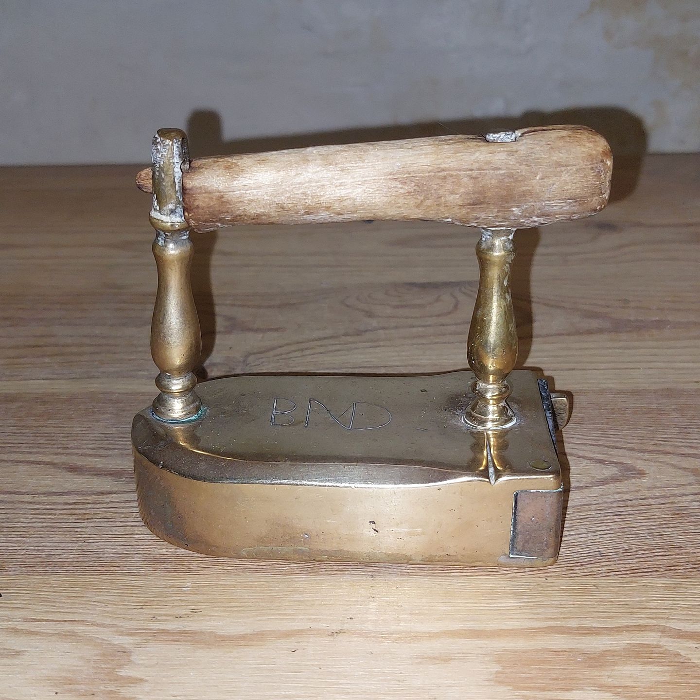 Butsnudet strygejern I messing med håndtag I træ fra første halvdel af 19. århundrede. Ejerinitialer BND. Formodes at være fremstillet i Danmark. Håndtaget med defekt (se fotos). Lågen kan åbnes. Mål: H. 10,5 cm L. 11 cmv/ Jesper Reutemann