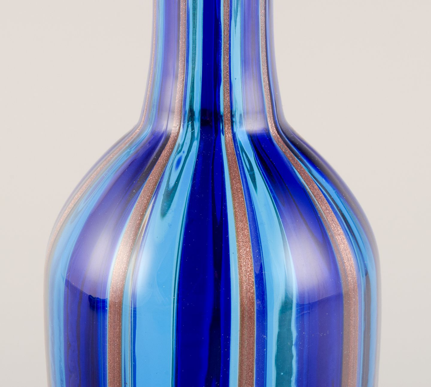 Murano, Italien. Karaffel i kunstglas med stribet design.Blå nuancer med guldstriber.