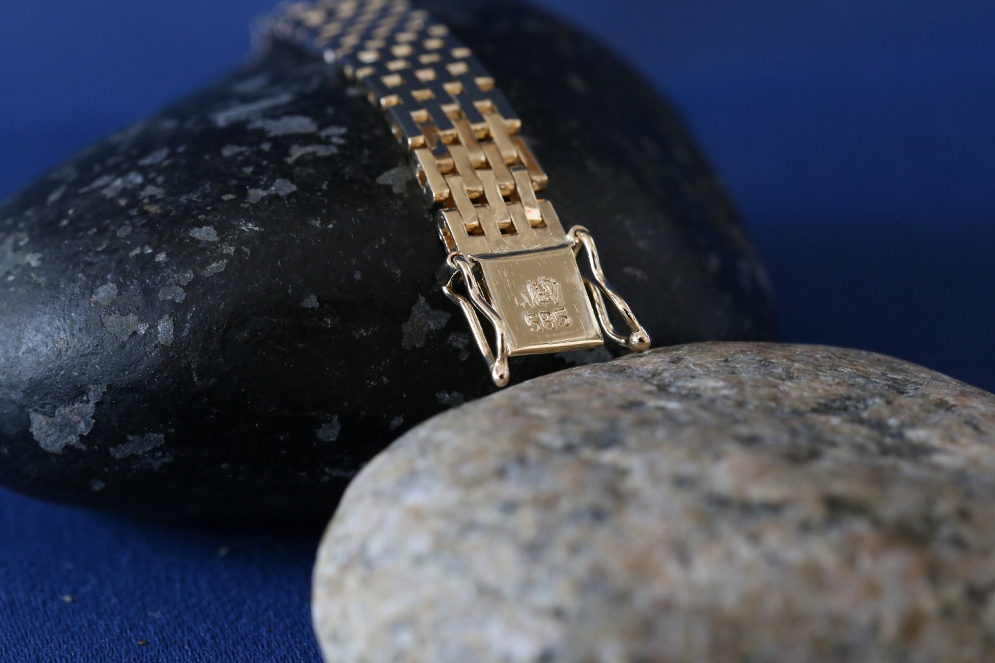 Elegant guldarmbånd i 14 karat guld, med kasselås. Guldarmbåndet er udført som mursten i 7 rækker, hvilket giver armbåndet et diskret men elegant look på håndleddet. Armbåndet har kasselås, hvilket gør det let at åbne og lukke.Længde: 19,7 cm.