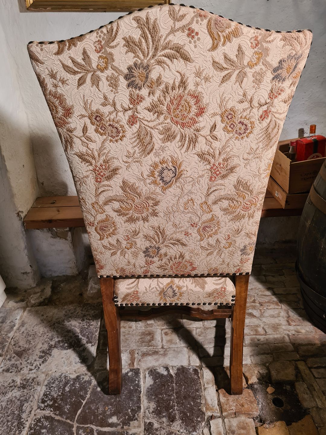 Flot gammel kongestol i eg og stofbeklædt ryg og sæde. Fremstår stabil og velholdt uden nævneværdige brugsspor.HxBxD 135x77x70 cm.