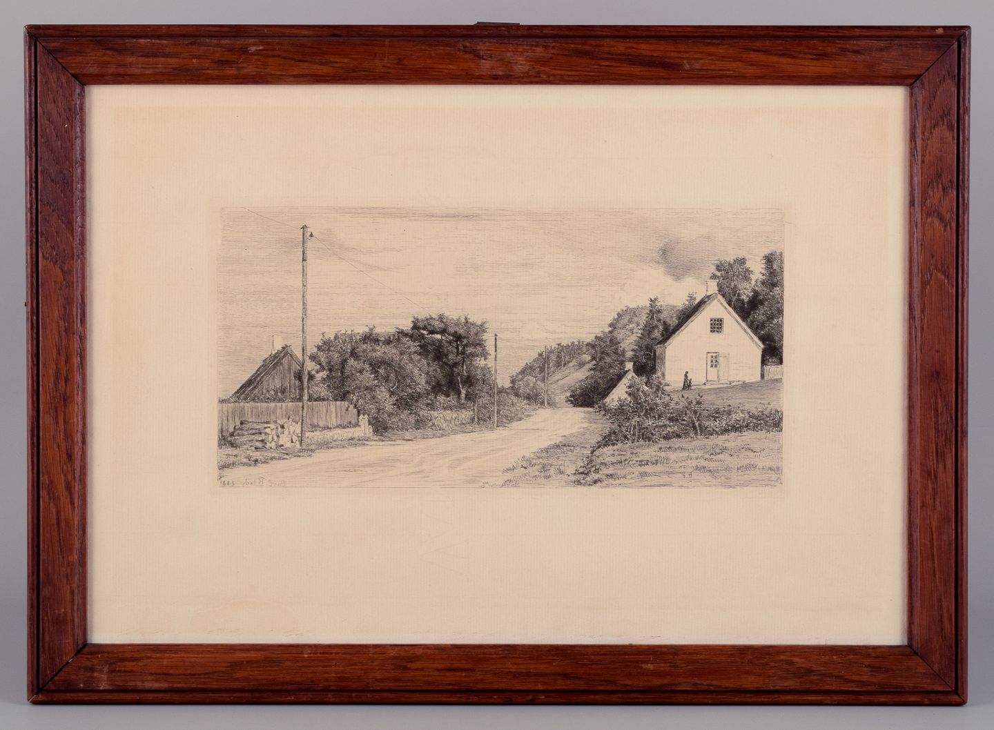 Carl Bloch (1834–1890). Etching. Houses by the road.Dated 1883.