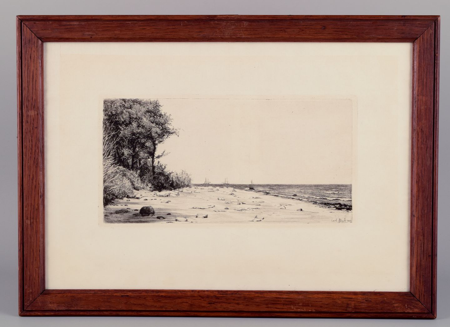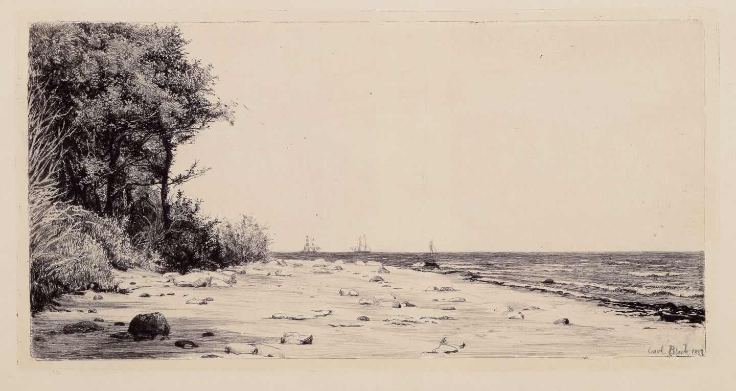 Carl Bloch (1834–1890). Etching of a Danish coastal scene with sailboats on the sea. Hornbæk.Dated 1883.
