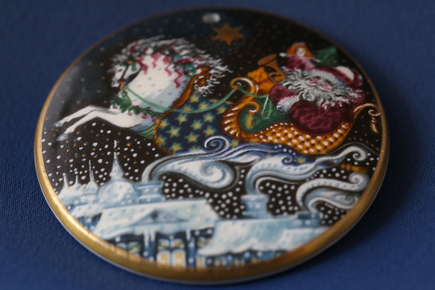 Smuk lille ornament "Santa Claus collection" 1991, med smukt julemotiv. Motivet er julemanden i kane over by, der fremstilles romantisk i flotte bløde farver.Diameter: 5,5 cm.