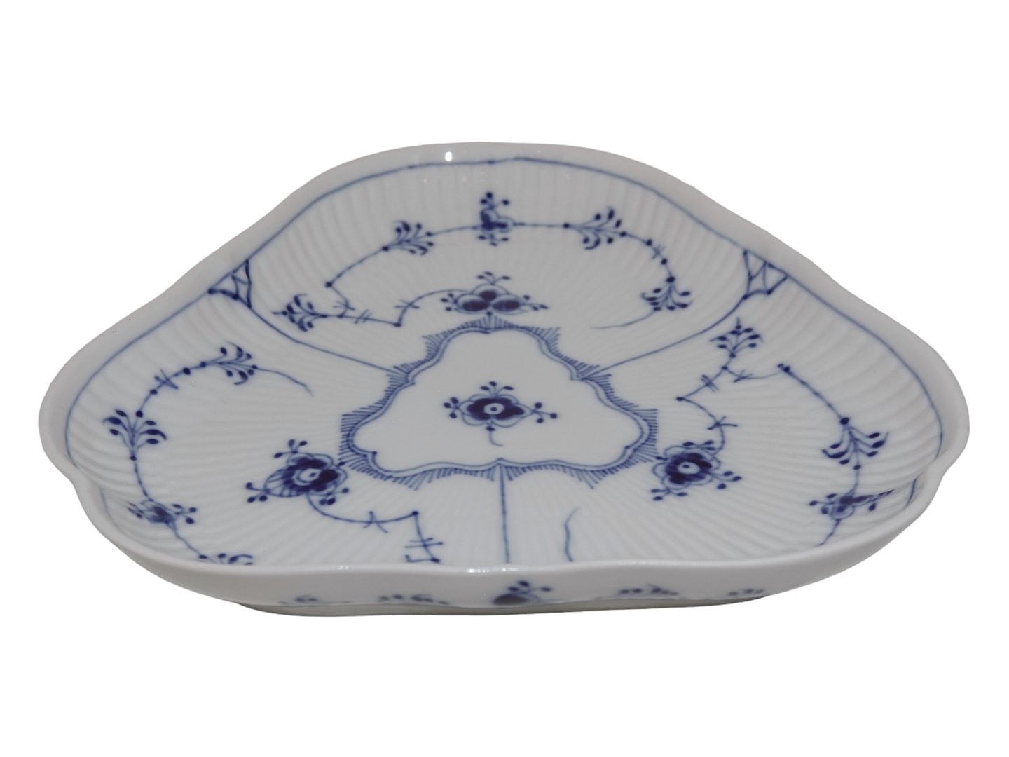 Royal Copenhagen Musselmalet Riflet, trekantet fad.Af fabriksmærket kan det udledes, at denne er produceret i 1963.