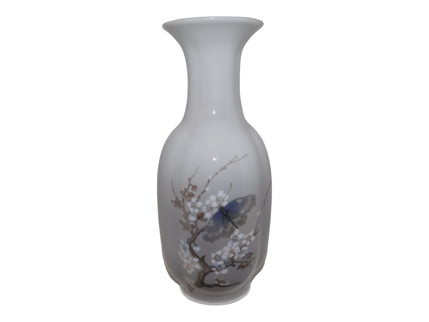Royal Copenhagen større vase i kantet form dekoreret med kirsebærgrene og sommerfugl.Bemærk denne vare er på vores fjernlager. Den kan købes online eller hvis du vil se den i butikken, så skriv eller ring. Vi kan ofte have den i butikken samme dag.