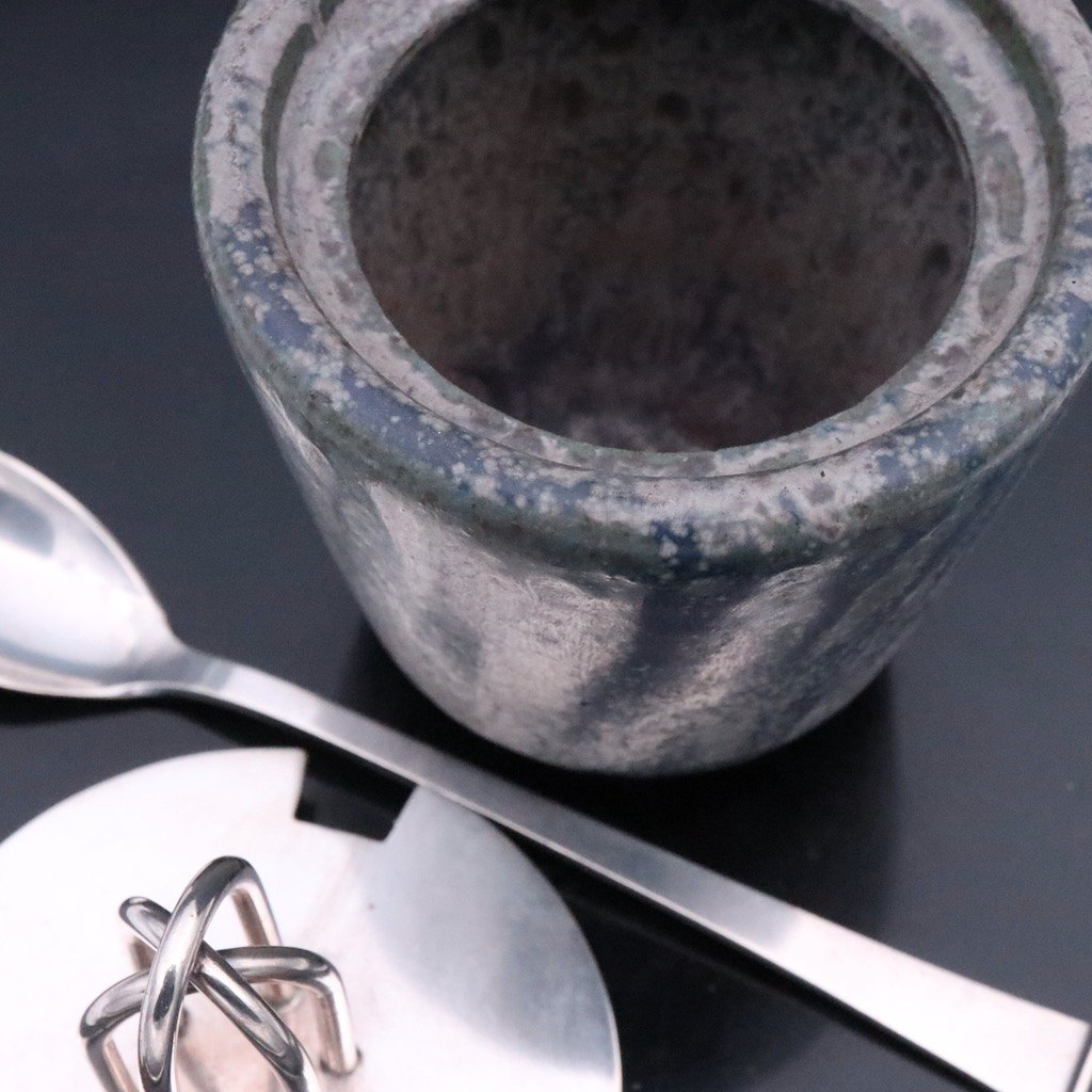 Arne Bang - O.M.V. Ehlers. Krukke i stentøj med låg og ske i sterling sølv.Stentøjskrukke med glasur udført hos Arne Bang (1901 - 1983).