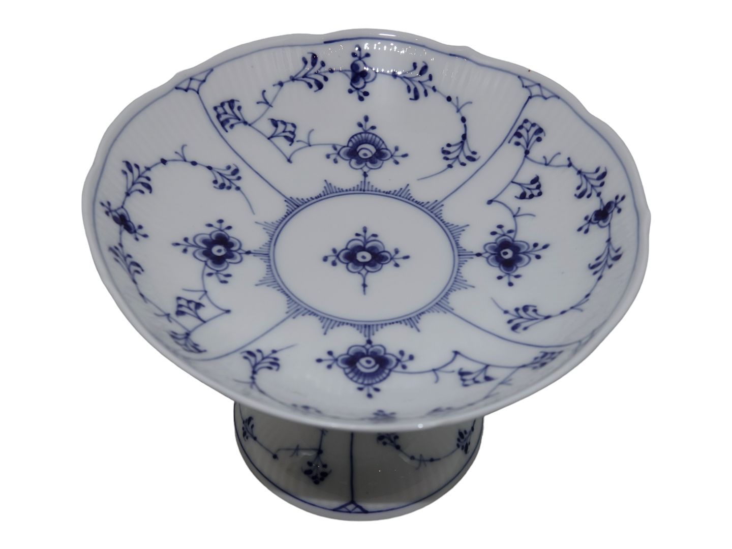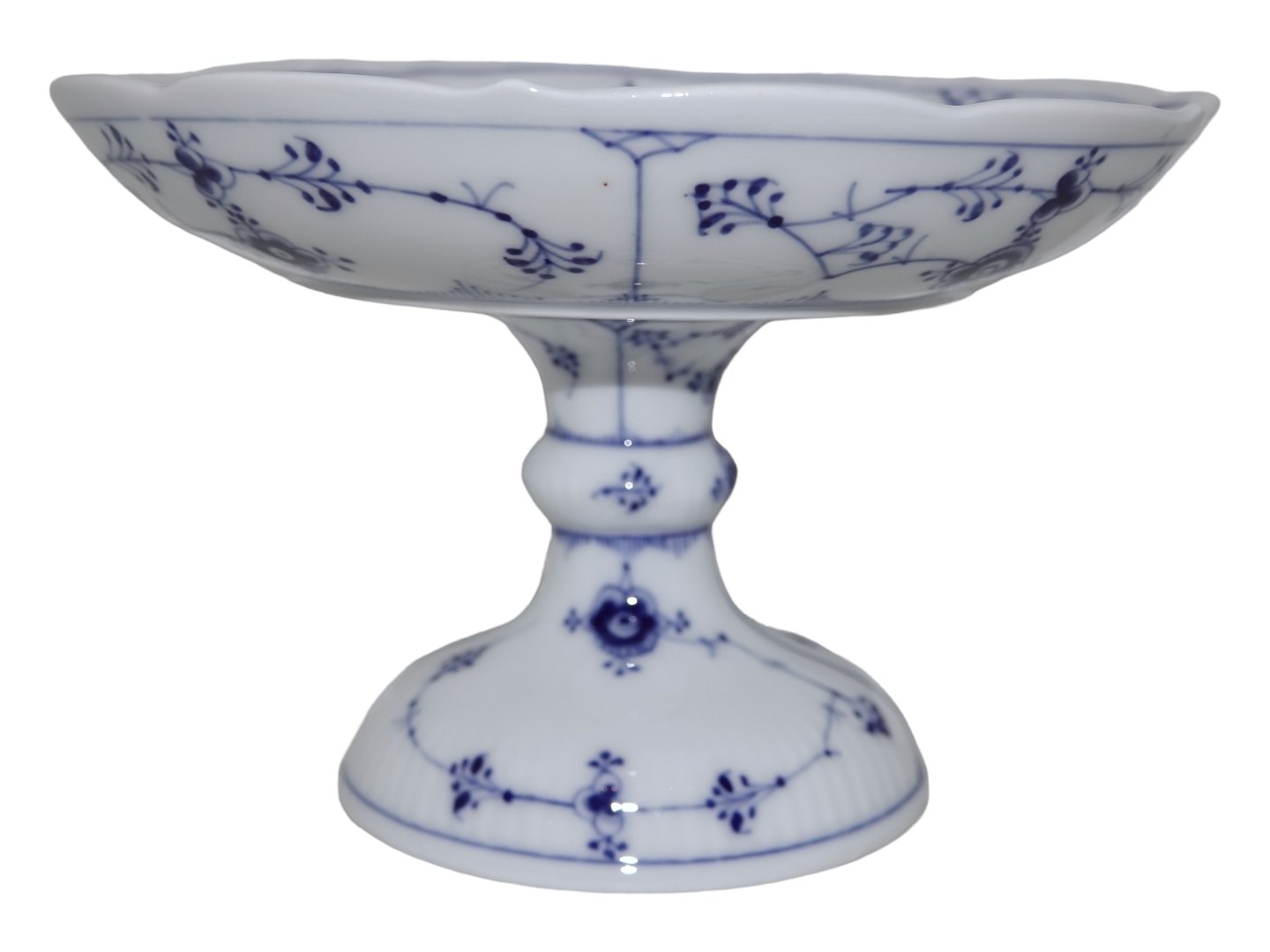 Royal Copenhagen Musselmalet Riflet, lille kageopsats på fod.Fabriksmærket viser, at denne er produceret mellem 1898 og 1923.