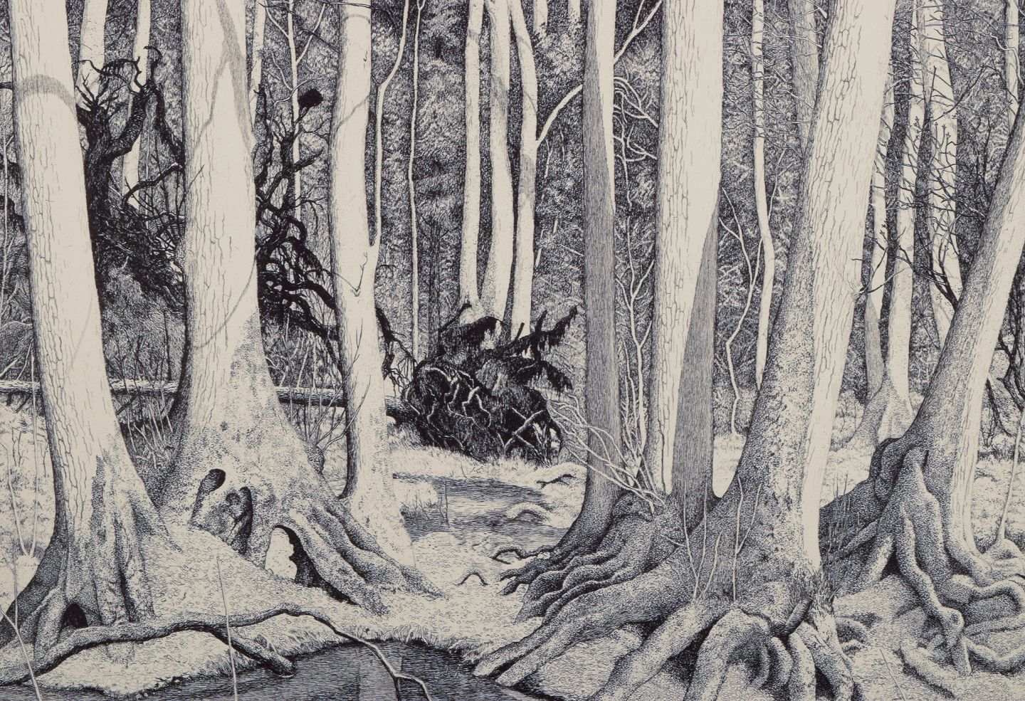 Eva Holmén-Edling (1942), svensk kunstner. Træsnit på japanpapir.Motiv af skov.